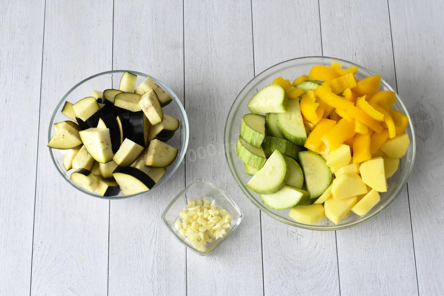 Картофель очистите и нарежьте ломтиками. Болгарский перец очистите от семян и плодоножки и нарежьте средними кусочками. Кабачок вымойте и нарежьте полукружьями. Баклажан промойте и нарежьте четвертинками. Чеснок порубите.