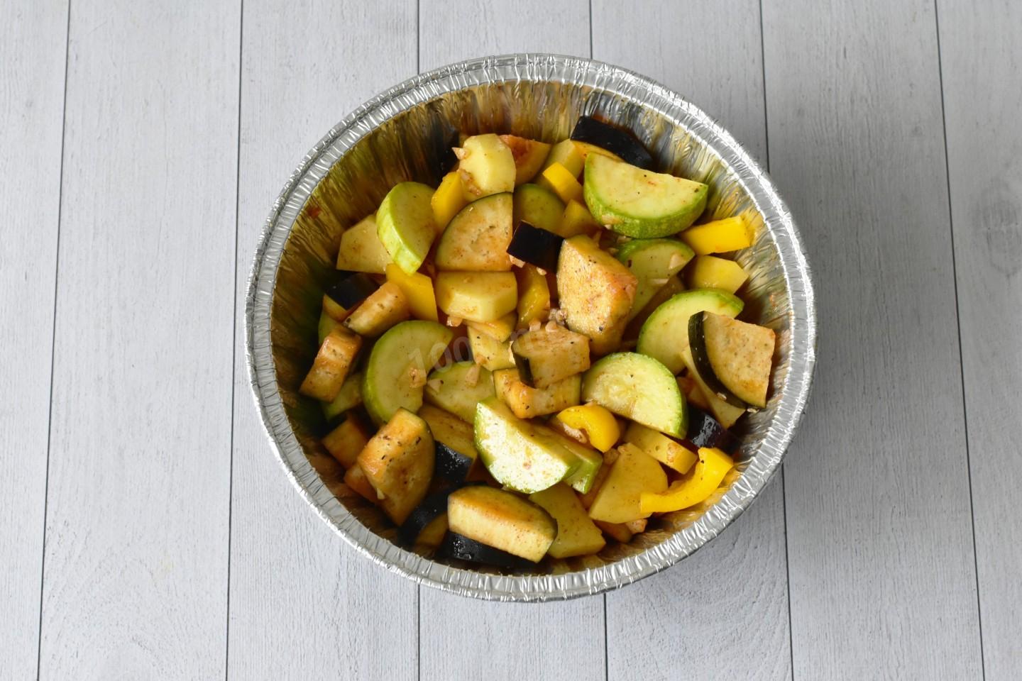 В миске соедините картофель, болгарский перец, кабачок, баклажан и чеснок. Влейте оставшееся растительное масло, всыпьте паприку, черный молотый перец и соль и перемешайте. Выложите овощи в форму для запекания. Поставьте форму в чашу аэрогриля на решетку.