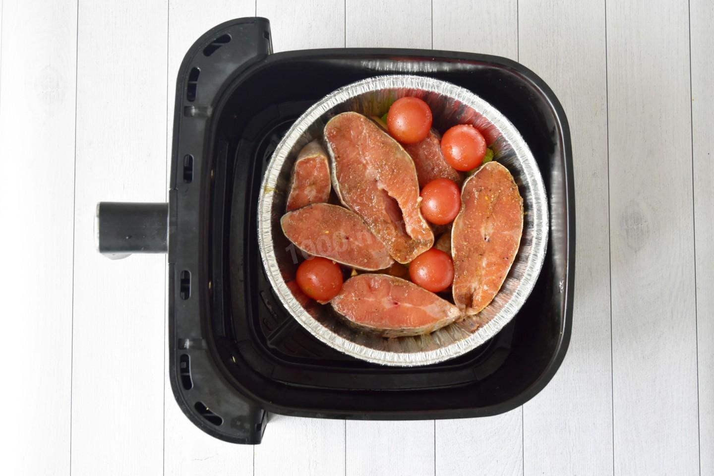 Запекайте овощи около 20 минут при 200℃. Во время запекания пару раз перемешайте овощи. Более подробная информация об особенностях запекания в аэрогриле есть в конце рецепта под шагами. Затем в чашу к овощам выложите рыбные стейки и помидоры черри.