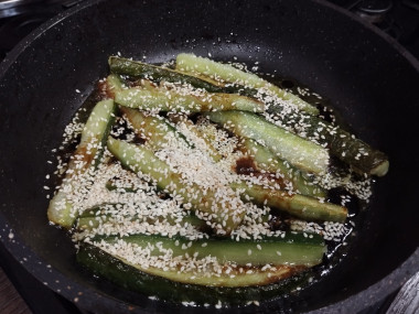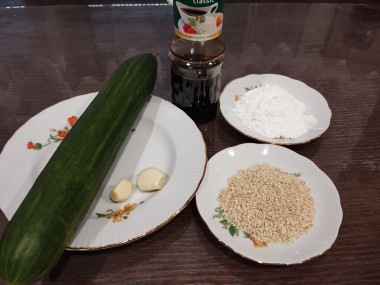Огурец порезала на длинные дольки,слегка посыпала солью и оставила на 15 минут. Выделилось немного воды,которую слила,а огуречный дольки обсушила бумажными полотенцами. Выложила в глубокую чашку,добавила кукурузный крахмал и перемешала. На сковороде слегка обжарила кусочки чеснока , затем убрала чеснок и мелко порезала. В эту же сковороду выложила огуречные дольки и обжарила с двух сторон, добавила соевый соус, кунжут,перемешала и ещё немного потомила до испарения соевого соуса.