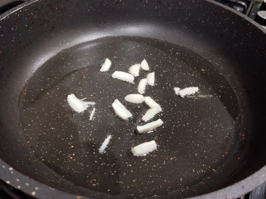 В сковороде разогрейте растительное или оливковое масло (я использовала больше, чем указано в рецепте). Отправьте чеснок обжариваться. Как только чеснок приобретёт слегка золотистый оттенок, выловите его из сковороды при помощи вилки или чайной ложки и уберите в отдельную небольшую ёмкость. Масло напиталось чесночным ароматом, можно приступать к следующему шагу.