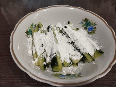 Обваляйте огуречный дольки в кукурузном крахмале. По желанию можете использовать картофельный крахмал или вовсе пропустить этот шаг. Но как показала практика, с крахмалом блюдо получается интереснее.