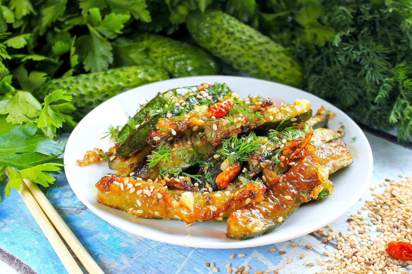 Жареные огурцы подают горячими или теплыми, как самостоятельную закуску. Отлично сочетаются с рисом, лапшой, мясом на гриле. Можно подавать как гарнир к рыбе или курице. Посыпьте свежей зеленью (укроп, зеленый лук, кинза) для яркости. В азиатском стиле — с долькой лайма и дополнительной порцией кунжута. Хорошо идут с холодным пивом или саке.