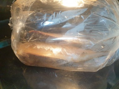 Переложите скумбрию в рукав для запекания. Полейте каждую рыбину жидким дымом внутри и снаружи. Крепко завяжите рукав с двух сторон, чтобы жидкость не вытекала во время запекания, положите на противень.
