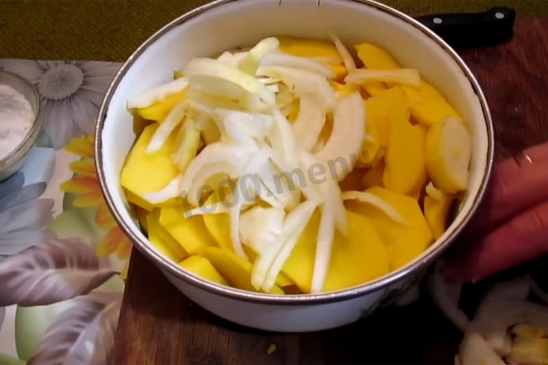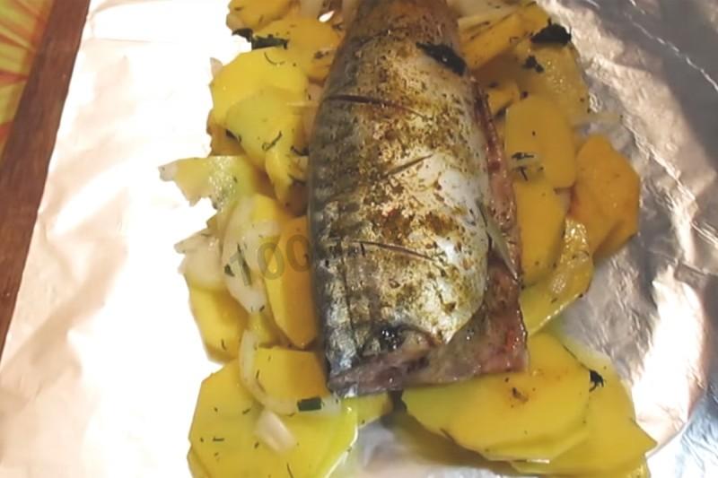 На фольгу выложите луково-картофельную подушку. Сверху - рыбу.Шаг 5: