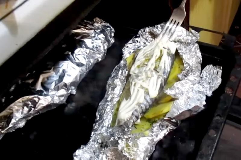 Потом откройте фольгу, смажьте рыбу майонезом и запеките в течение еще 5 минут.Шаг 7: