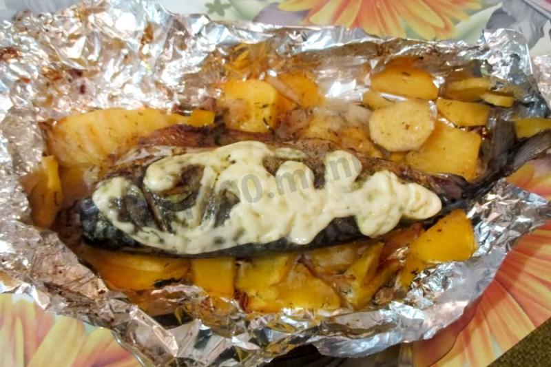 Фольгу запечатайте и поставьте рыбу в духовку (на 1 час при 180 градусах).Шаг 6:
