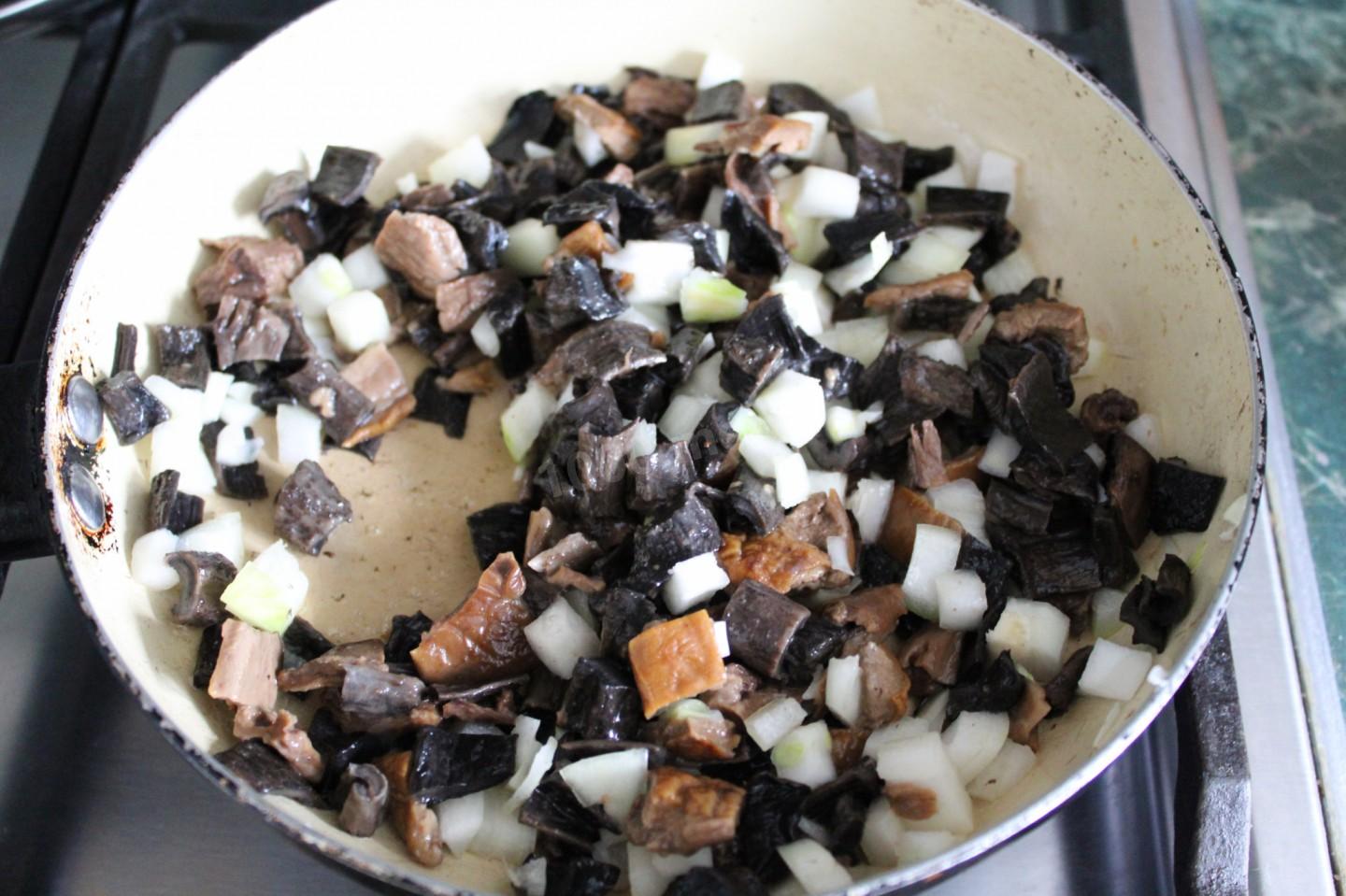 Грибы нашинковать кубиками и спассеровать с луком на сливочном масле.Шаг 5:
