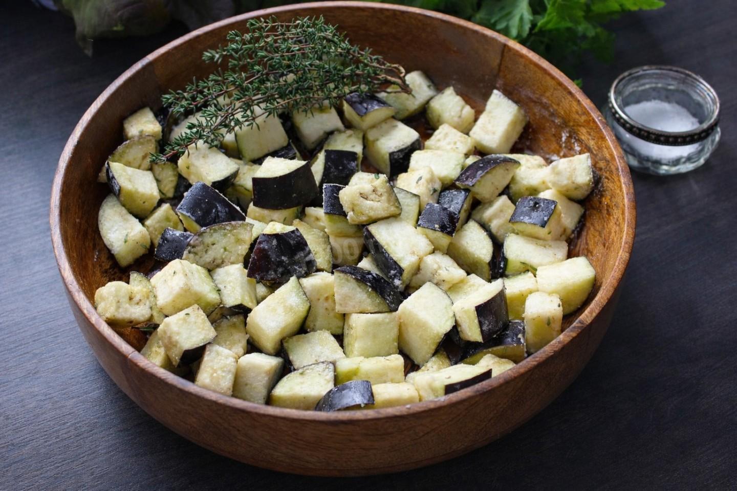 Баклажаны вымойте и обсушите бумажным полотенцем. Нарежьте синенькие кубиками среднего размера и отправьте в глубокую миску. Если необходимо, удалите горечь. Полейте маслом, посолите и добавьте специи. Всё перемешайте.