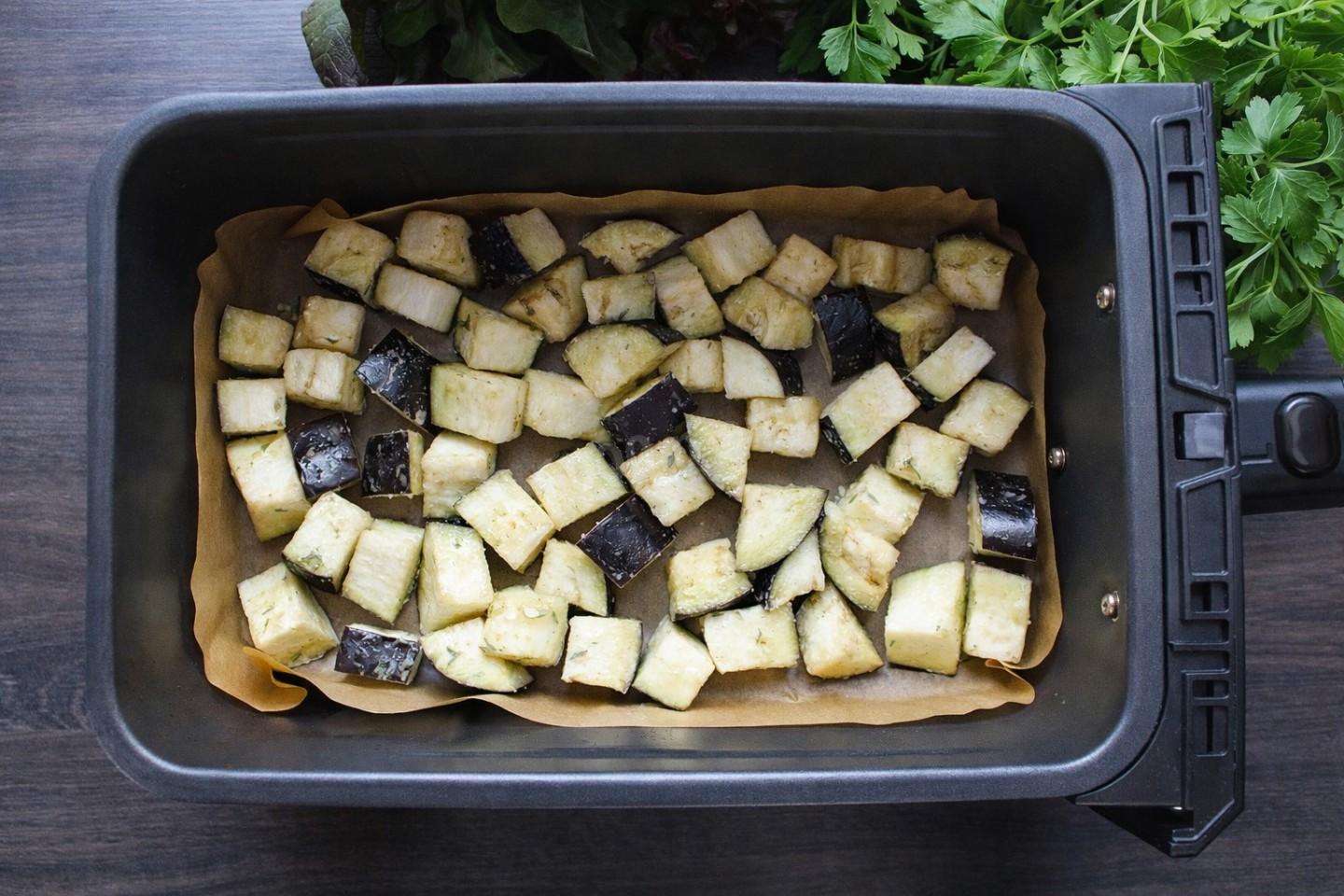 Выложите баклажаны в чашу аэрогриля, застеленную пергаментом, одним ровным слоем. Сделайте так, чтобы кусочки не соприкасались друг с другом, иначе они слипнутся и не получится хрустящей корочки. Запекайте баклажаны примерно 15-20 минут при температуре 190 градусов.