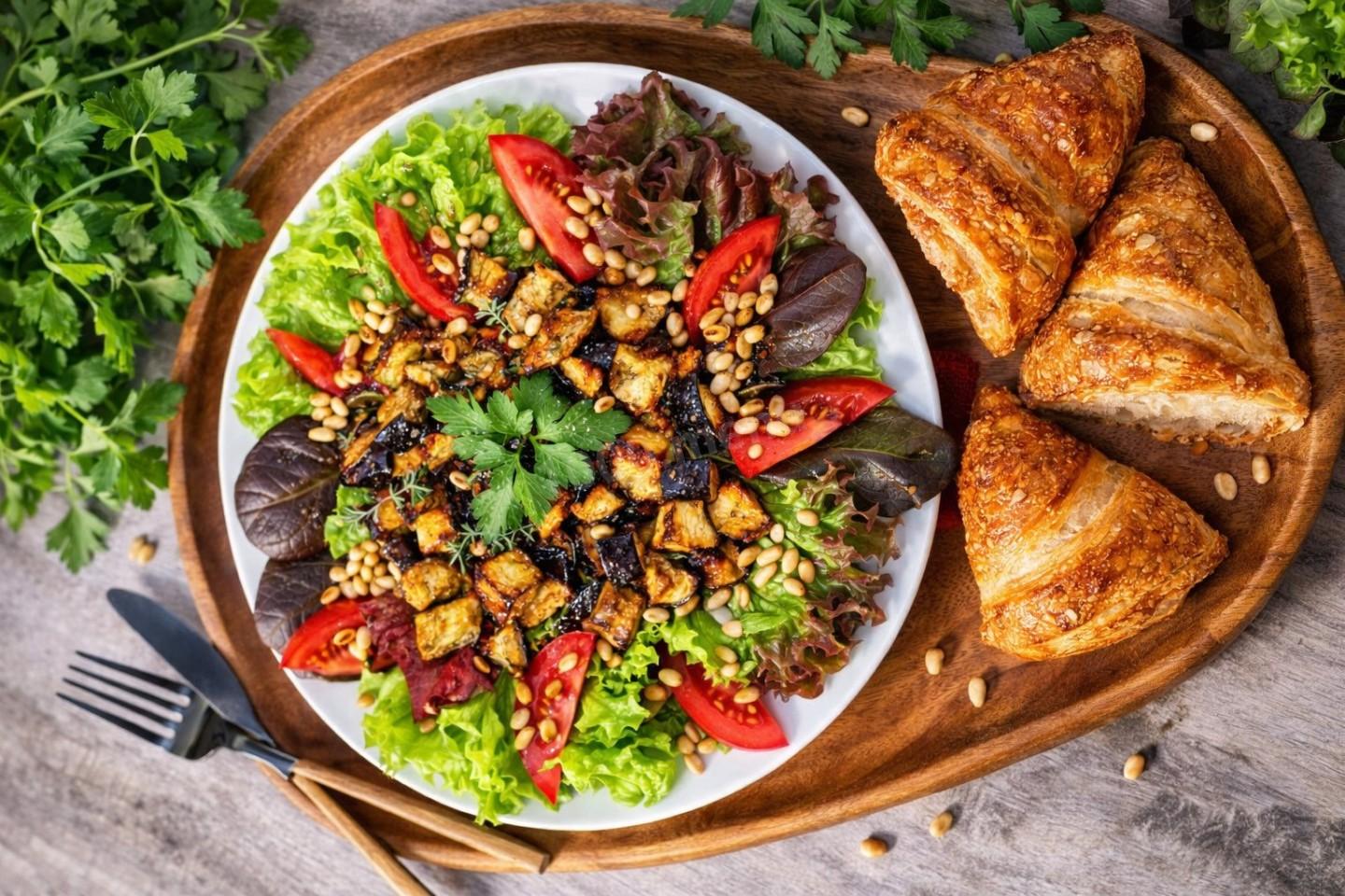 Крахмал при запекании создаёт тонкую плёнку, которая «запечатывает» влагу внутри баклажана — секрет сочной серединки и хрустящей корочки.