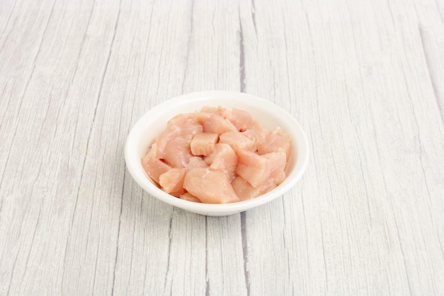 Куриное заранее разморозьте, промойте, обсушите бумажными полотенцами. Нарежьте филе небольшими кубиками.