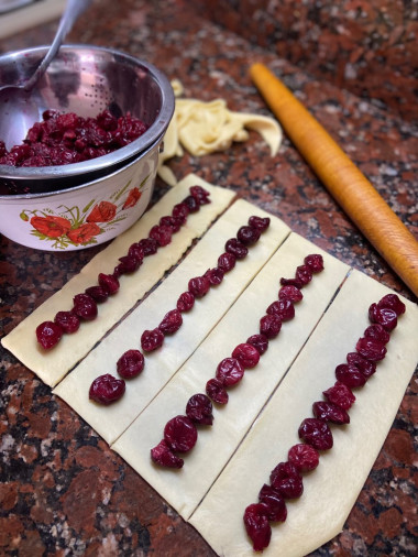 В каждую полоску выложите вишню в ряд и защипите края. Выложите готовые трубочки на противень, застелённый пергаментом, и отправьте в духовку, разогретую до 200 градусов, примерно на 15 минут до легкого золотистого оттенка. Точное время зависит от вашей духовки. Узнать об особенностях работы духовок можно, прочитав отдельную статью, ссылка в конце рецепта. Готовые трубочки выньте из духовки и остудите.