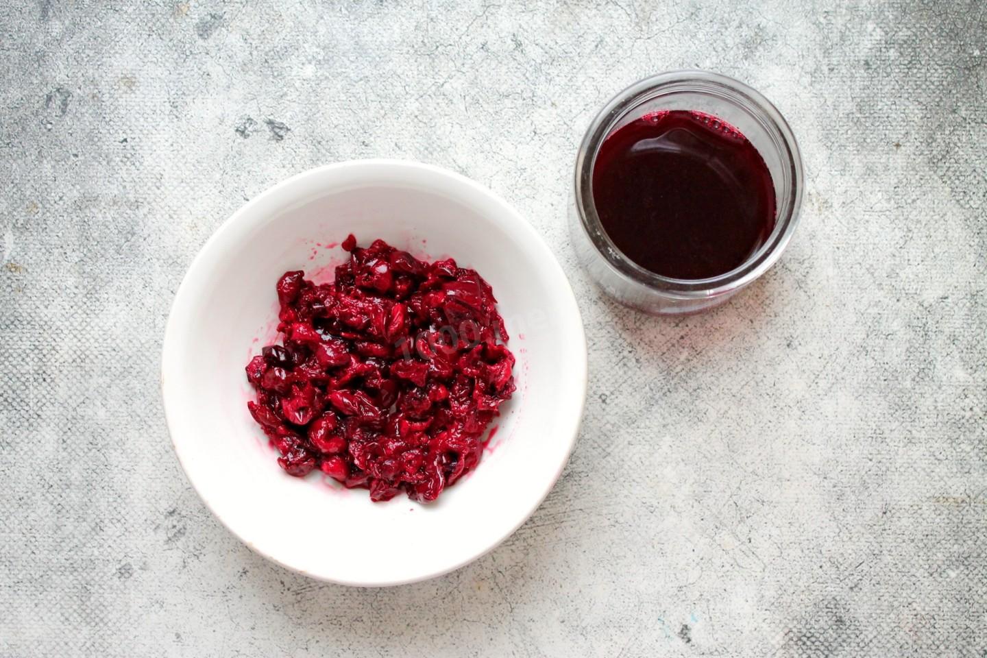 У вишни удалите косточки. Это можно сделать при помощи специального приспособления или любым другим удобным способом. Подробнее об это читайте в конце рецепта. Косточки не понадобятся, а вот мякоть помните толкушкой, чтобы вишня пустила сок. Получившийся сок слейте и уберите в холодильник.