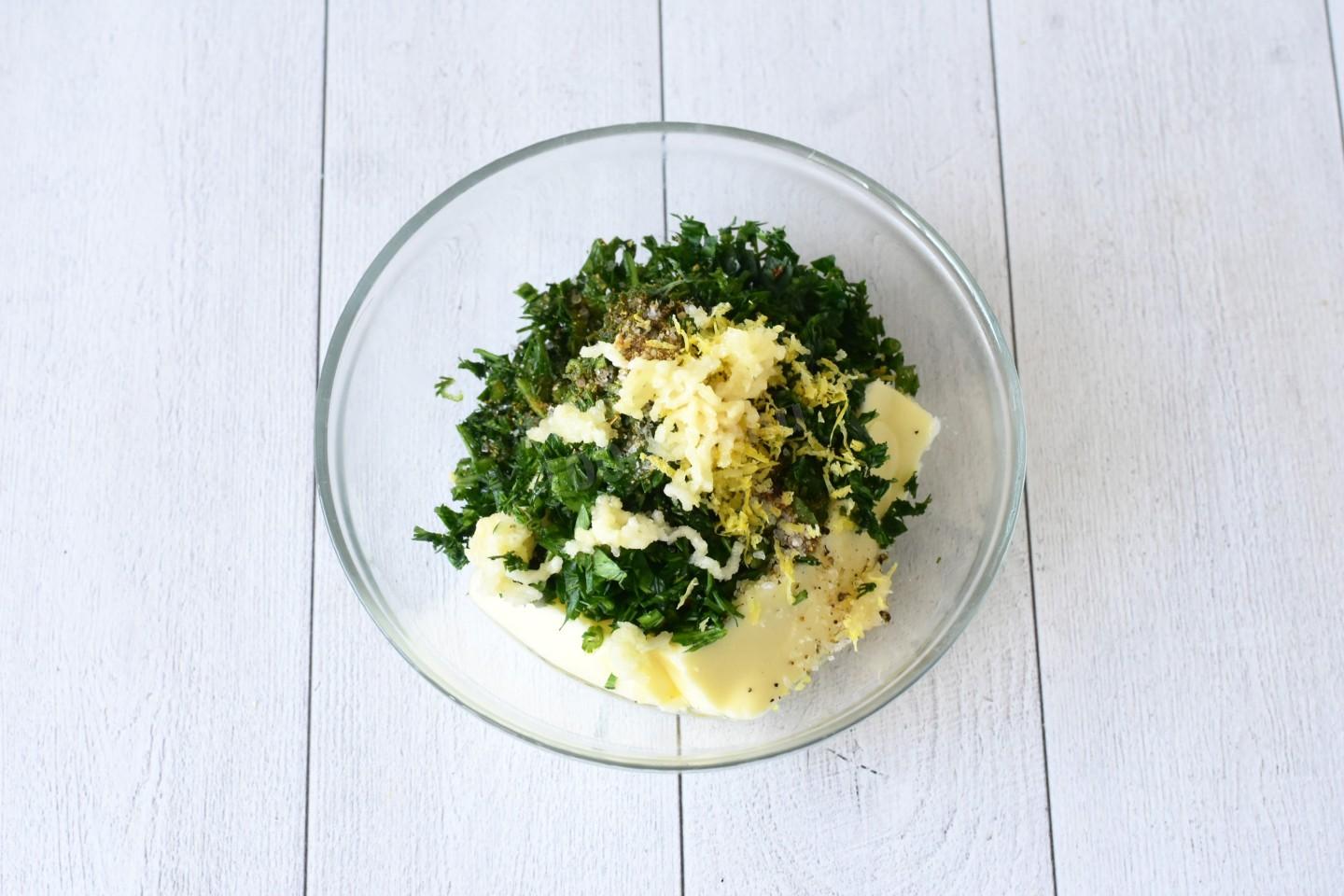 В мягкое сливочное масло комнатной температуры добавьте измельченную зелень, пропущенные через пресс или мелко нарезанные зубчики чеснока, тертую лимонную цедру, соль и перец. Все перемешайте до однородности. Сливочное масло выложите на пищевую пленку и сверните, формируя длинную колбаску. Закрутите края. Уберите в морозилку на 30-40 минут.