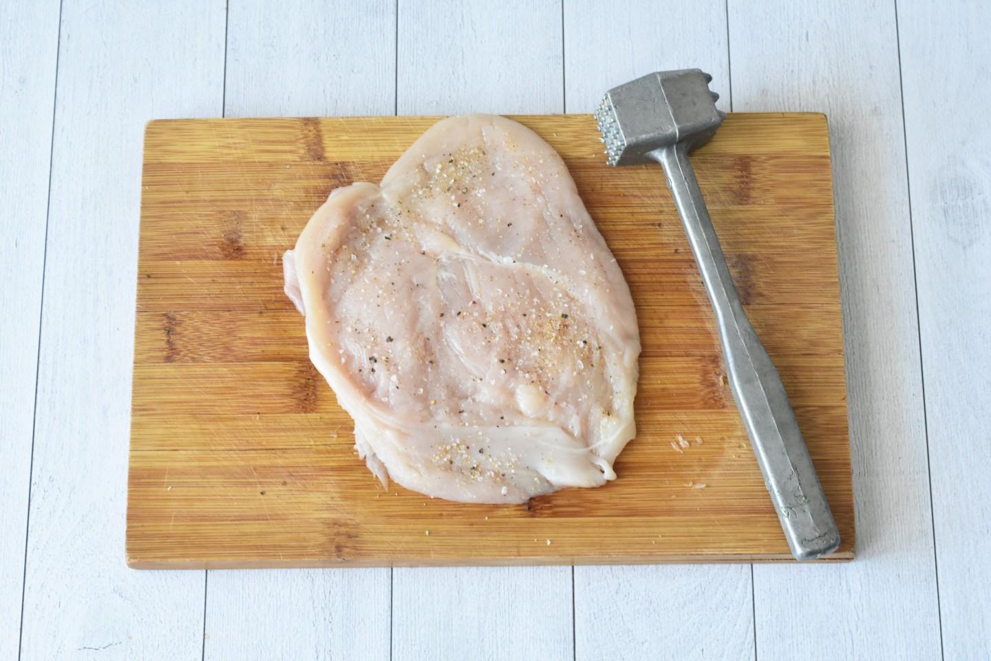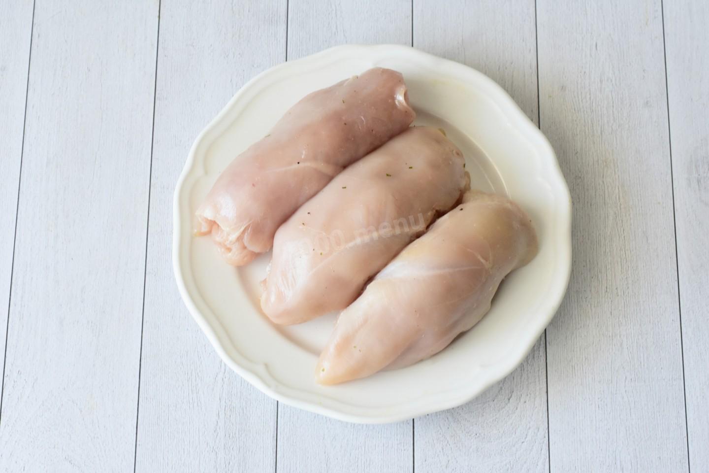 Куриное филе вымойте, обсушите. Каждое филе разрежьте вдоль, но не до конца и раскройте, как книжку. Мясо аккуратно отбейте плоской стороной молоточка с внутренней стороны, стараясь сохранить кусок целым. Филе посолите и поперчите по вкусу.