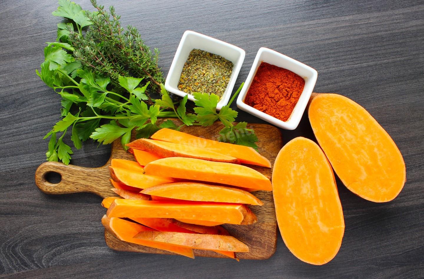 Батат тщательно вымойте и обсушите бумажными салфетками или кухонным полотенцем. Разрежьте сладкий картофель пополам, а затем каждую половинку на тонкие брусочки (как на фото).