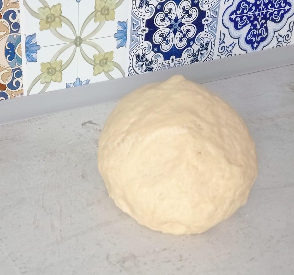 Собирите руками тесто в шар, затем выложите на рабочую поверхность и продолжайте вымешивать руками, пока оно не, станет однородным