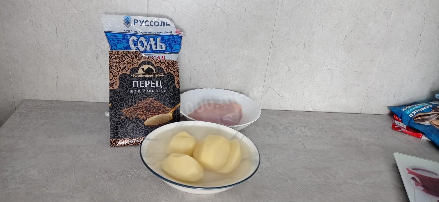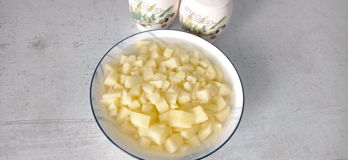 Помытый и очищенный картофель тоже нарежем мелким кубиком, пока что зальём водой, чтобы не почернел