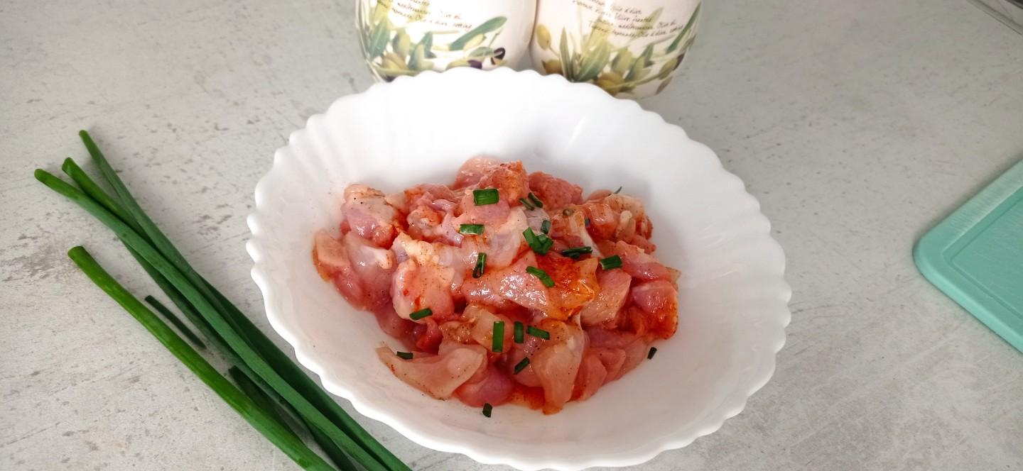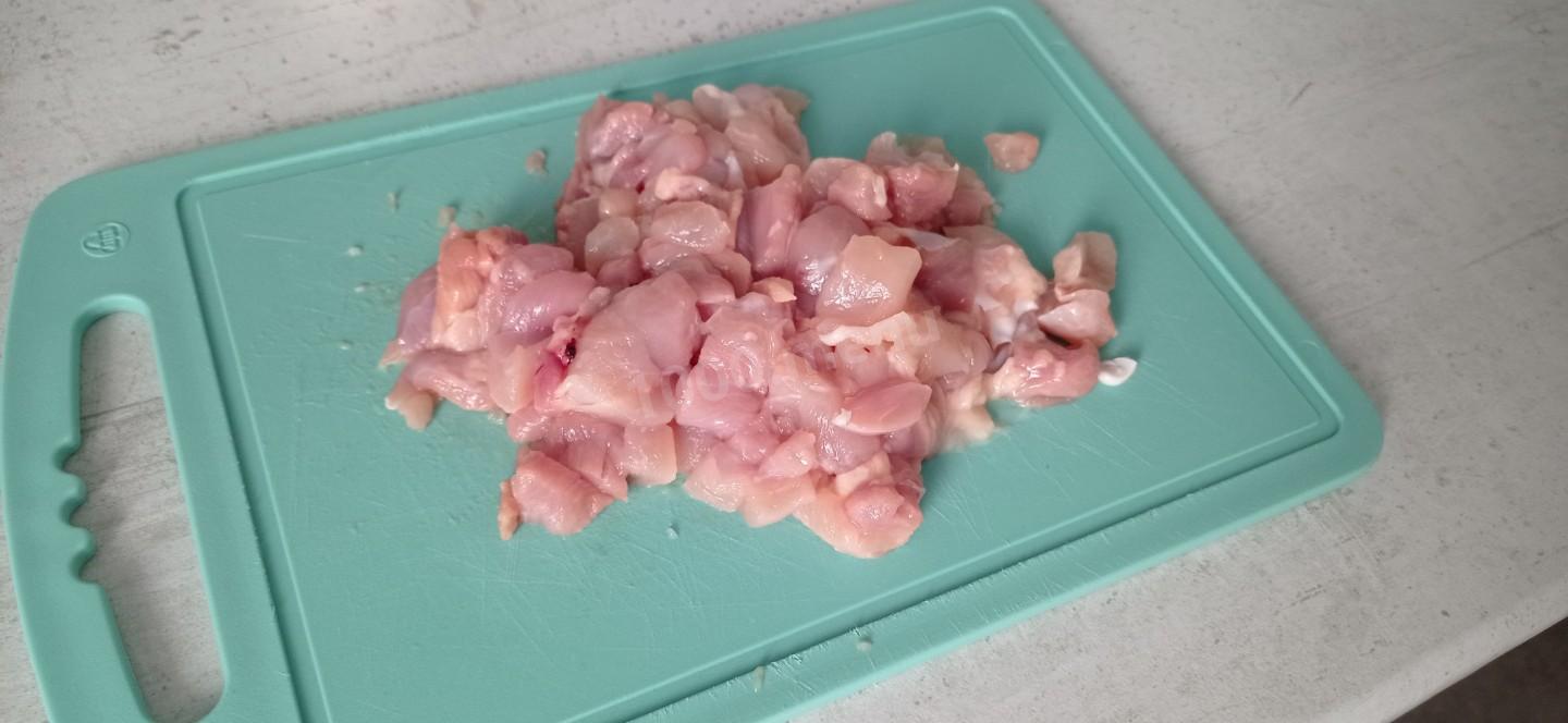 Куриное филе бедра промоем под проточной водой, обсушим бумажным полотенцем, затем нарежем небольшим кубиком