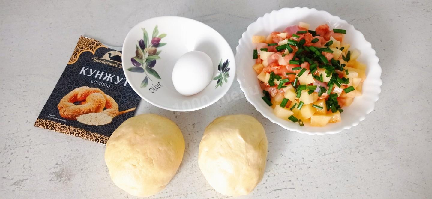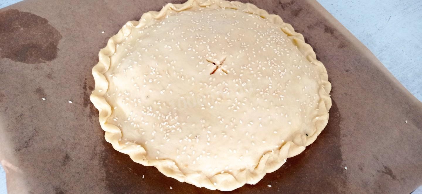 После того как края защипнули, смазываем поверхность пирога яйцом с помощью кисточки, посыпаем кунжутом и делаем небольшой крестообразный надрез, затем отправляем в зараннее разогретую духовку для выпечки. Температура 180 градусов, режим верх-низ,время 50-60 минут