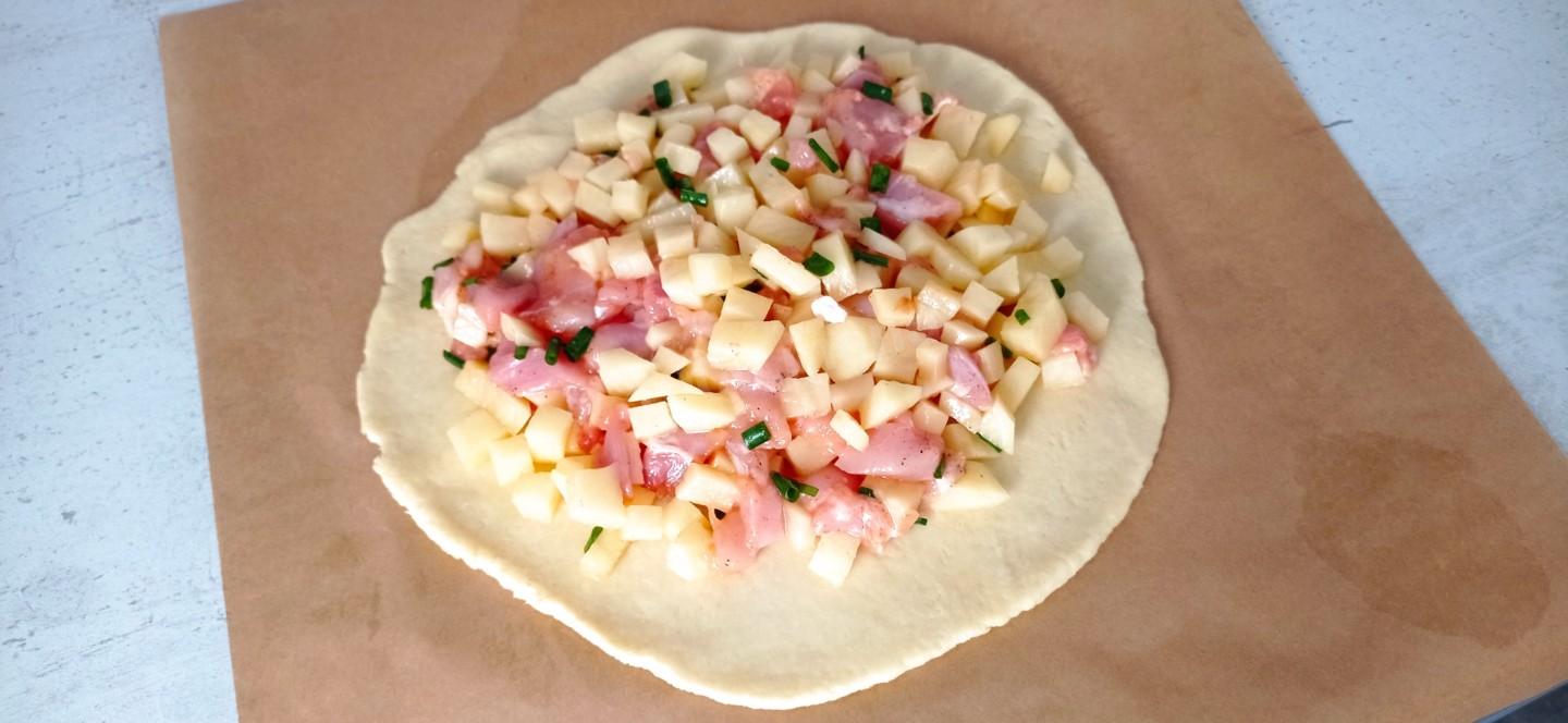 На нижнюю, раскатанную часть выкладываем начинку, края немного оставляем пустыми, чтобы удобно было защипывать