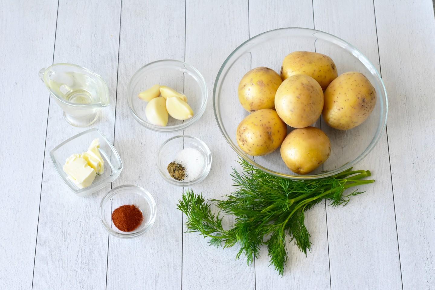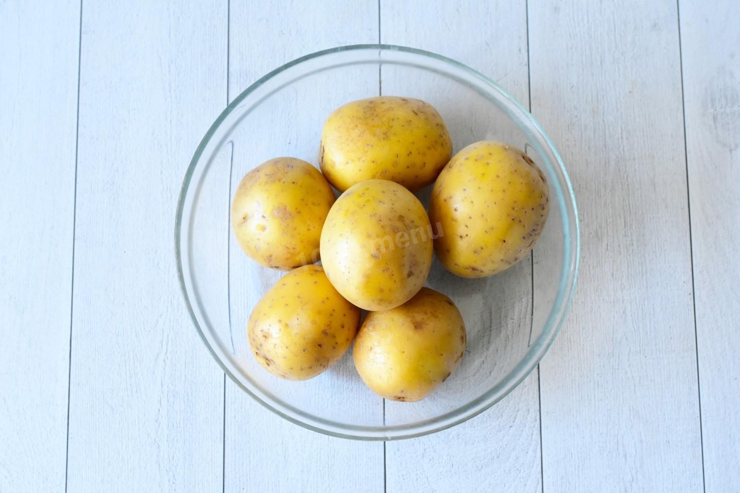 Подготовьте продукты по списку. Сорт картофеля влияет на длительность приготовления, вкус и внешний вид блюда. Для запекания нужна картошка с высоким содержанием крахмала. Если вы взяли картошку с низким содержанием крахмала, она может остаться сырой даже после длительной готовки.