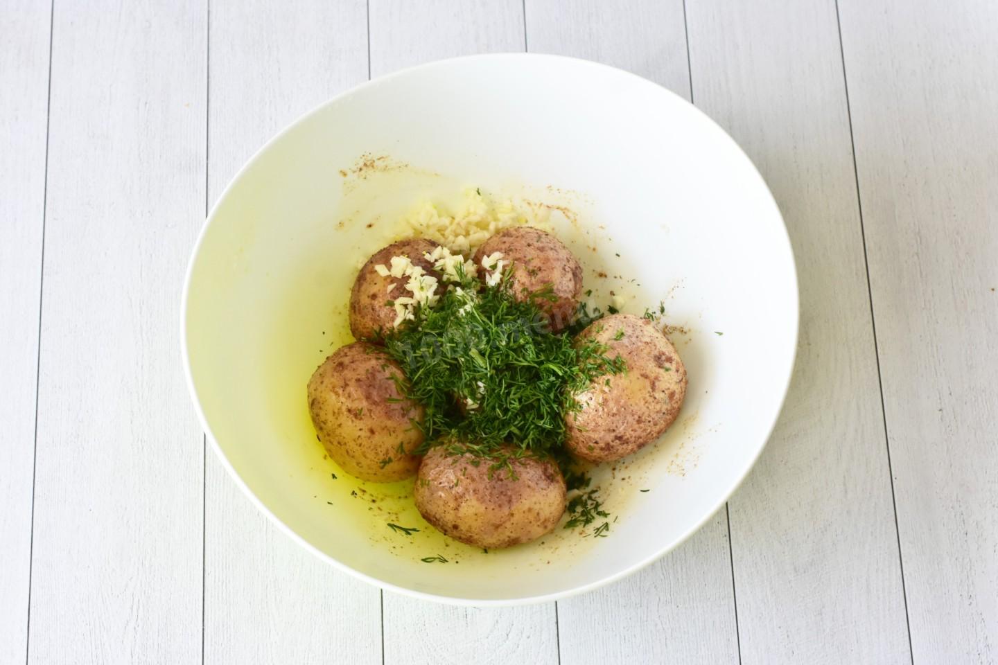 Запеченный картофель переложите в миску. Добавьте сливочное масло, чеснок и укроп и перемешайте.