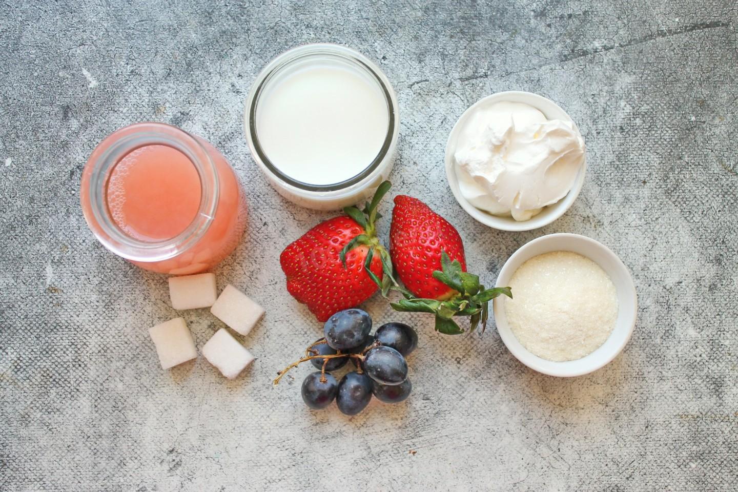Подготовьте все необходимые ингредиенты для приготовления. Ягоды переберите, ополосните и обсушите на бумажном полотенце. Для десерта подойдут любые ягоды, я взяла свежую клубнику и виноград. Чтобы в желейном слое были видны ягоды, сок лучше всего взять светлый. У меня сок белой и розовой смородины, но можно взять осветленный сок винограда.