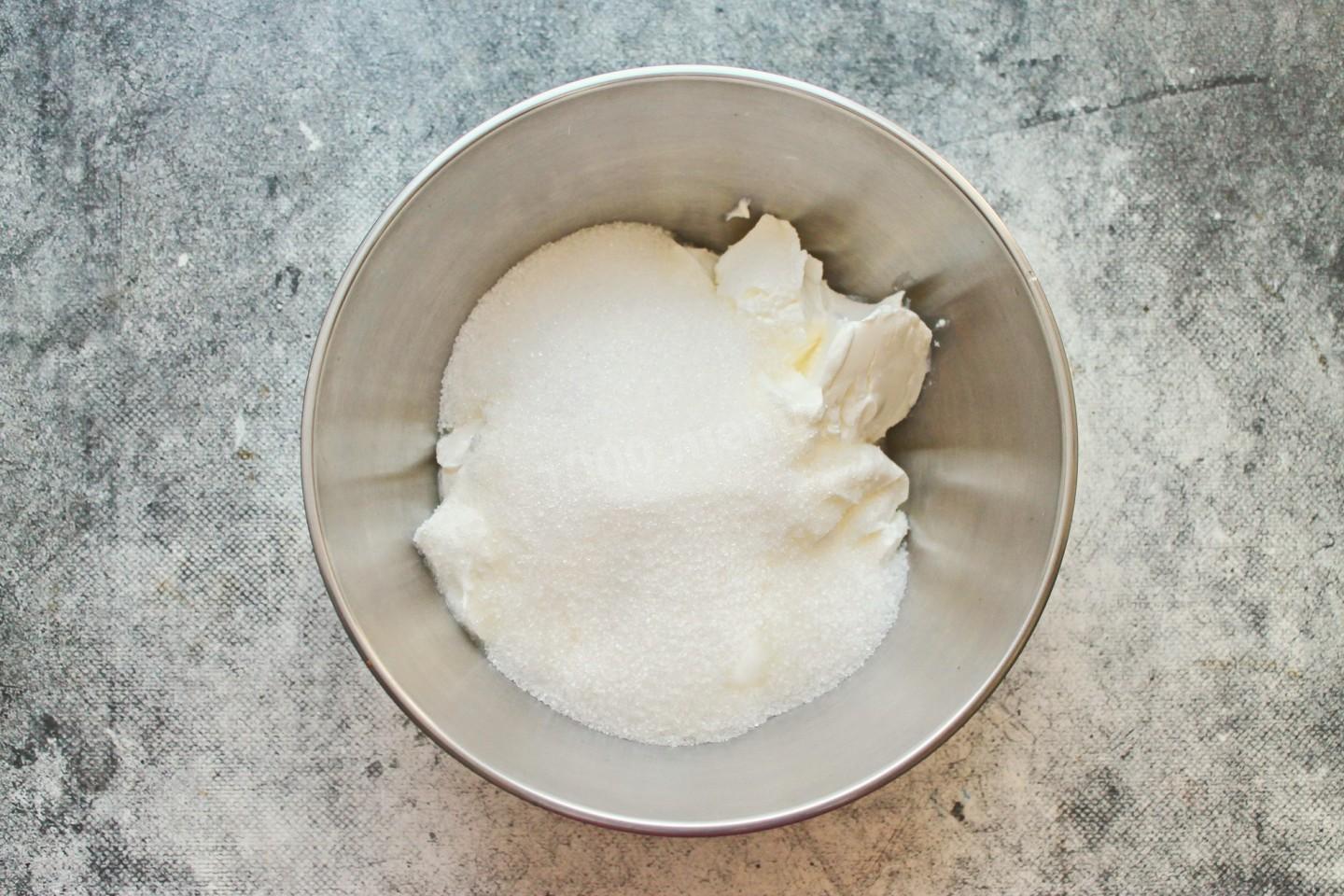 Сметану переложите в миску, добавьте сахар и хорошо перемешайте, оставьте все на 10-15 минут. За это время сахар растворится, а сметана нагреется. Сметану берите свежую, густую и жирную, так десерт будет более нежный.
