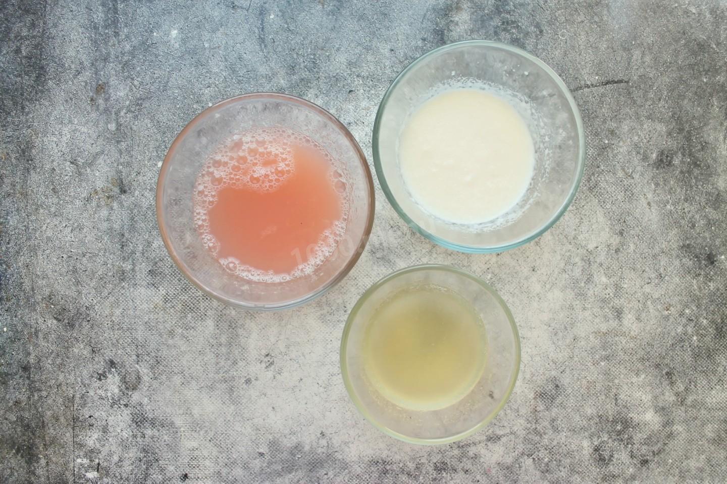 По трем мискам разложите желатин и залейте водой (для клубничного слоя), молоком (для сметанного слоя) и соком (для ягодного желе). Все перемешайте и оставьте для набухания. Время будет зависеть от вида желатина, поэтому внимательно прочтите инструкцию. У меня желатин силой 220 блюм.