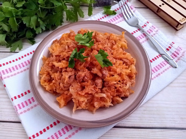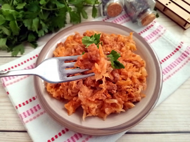 В другой сковороде с добавлением растительного масла потушите капусту, помешивая, до мягкости. Если овощ не очень сочный, по необходимости в процессе тушения можно добавить немного горячей воды. Если используете летнюю, сочную, свежую капусту, то тушите ее, не накрывая сковороду крышкой, чтобы испарялась лишняя влага. В процессе приготовления капусту посолите, добавьте любые приправы или специи на ваш выбор.