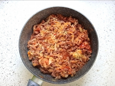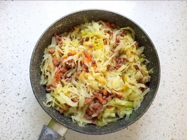 Соедините обжаренную массу из фарша и овощей с капустой, хорошо перемешайте. Потомите блюдо на слабом огне около 5-7 минут.