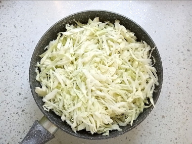 В эту же сковороду выложила нарезанную лапшой капусту, потушила ее с добавлением воды. Капусту посолила сразу, чтобы она быстрее отдала сок и уменьшилась в объеме.