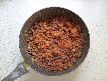 Выложите к овощам фарш, перемешайте. Обжарьте фарш с овощами, помешивая и разминая образующиеся крупные комочки. Фарш немного посолите, добавьте специи по вкусу.