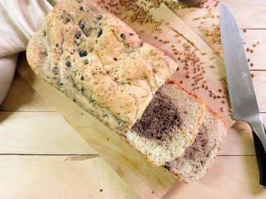 Хлебный мякиш получился с чёрными разводами от оливок. Так что хлеб не только очень вкусный, но и красивый. Настоящее произведение искусства!