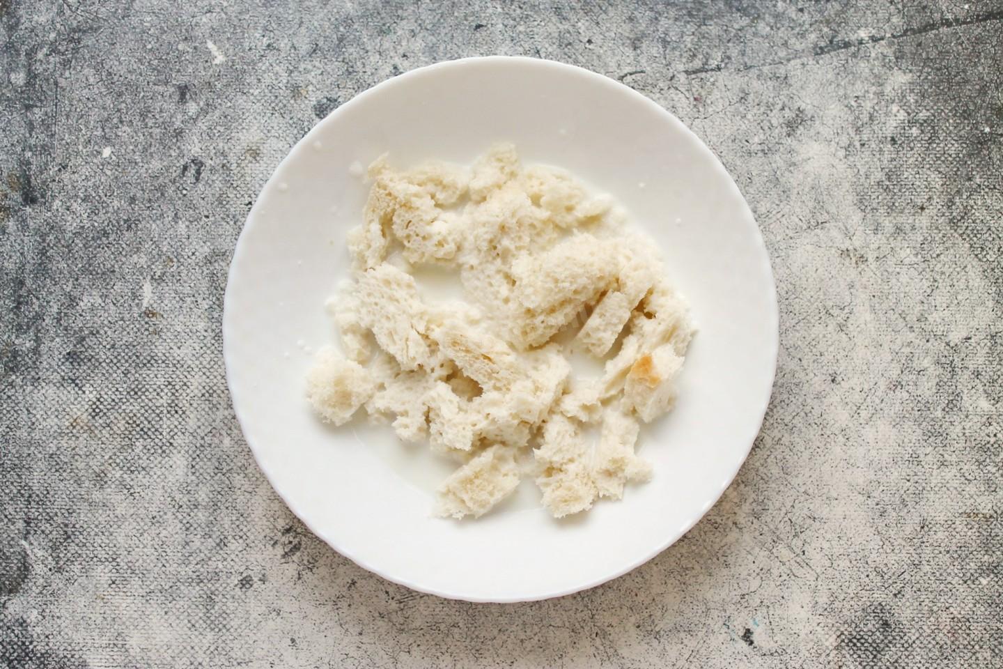 Удалите корочки хлеба, они не понадобятся. Раскрошите и положите в миску хлебный мякиш. Залейте хлеб молоком, перемешайте и дайте постоять 10 минут до размягчения и впитывания молока.