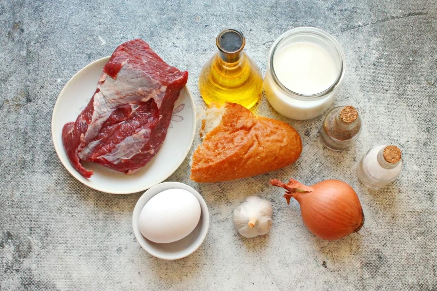 Говядину выбирайте свежую, ярко-красного цвета, с приятным запахом и упругой текстурой. Булочку берите вчерашнюю — она лучше впитывает молоко. Лук и чеснок — свежие, без ростков и повреждений.
