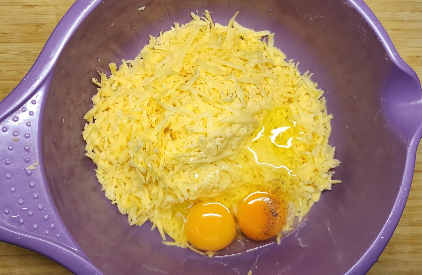Пока тесто отдыхает, займитесь начинкой Сыр натрите на крупной терке. Смешайте сыр с яйцами и черным молотым перцем