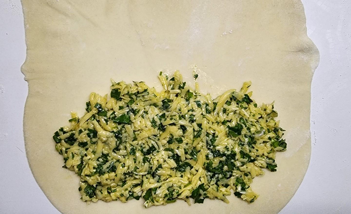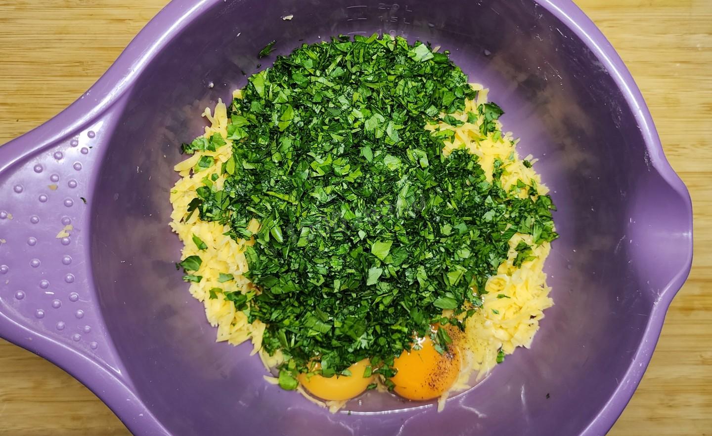 Заранее подготовьте ингредиенты. Твердый сыр можно заменить сулугуни или адыгейским - они придадут начинке нежную текстуру. С рассольными сырами будьте аккуратнее: их соленость влияет на количество соли в начинке. Что касается зелени, ориентируйтесь на сезон и свои предпочтения - смело берите шпинат, базилик, крапиву, кинзу, мяту или салатные листья.