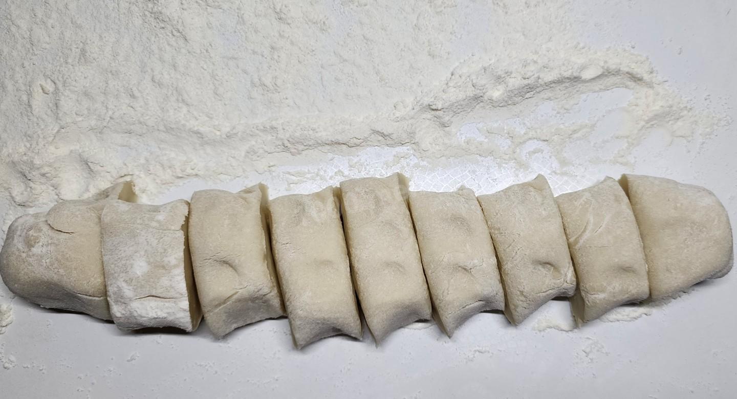Разделите тесто на небольшие шарики размером чуть больше грецкого ореха (примерно по 50-60 г). Один шарик - один кутаб.