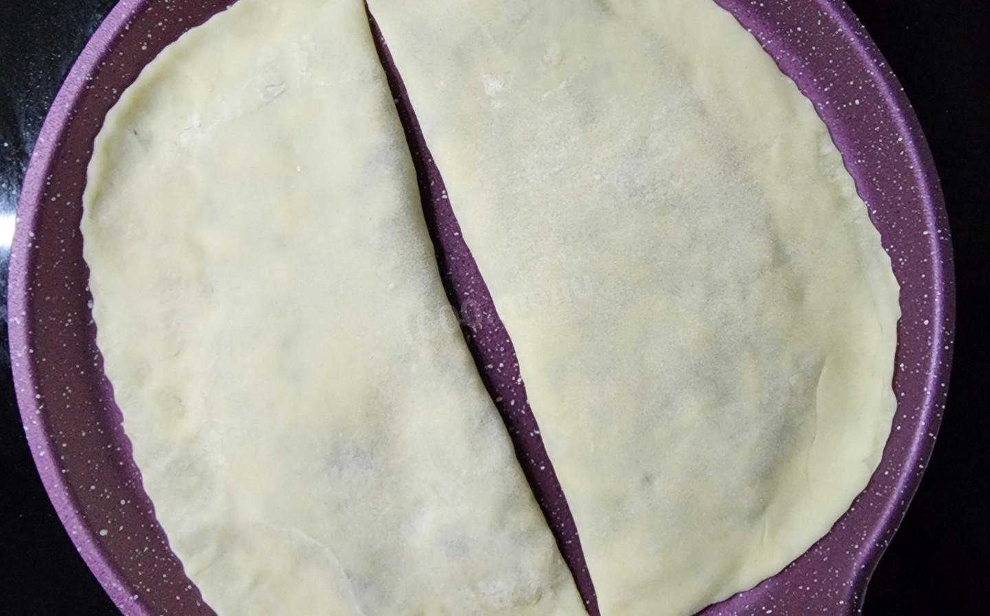 Накройте второй половиной теста. Плотно прижмите края пальцами, стараясь выгнать воздух изнутри, чтобы кутаб не вздувался при жарке.