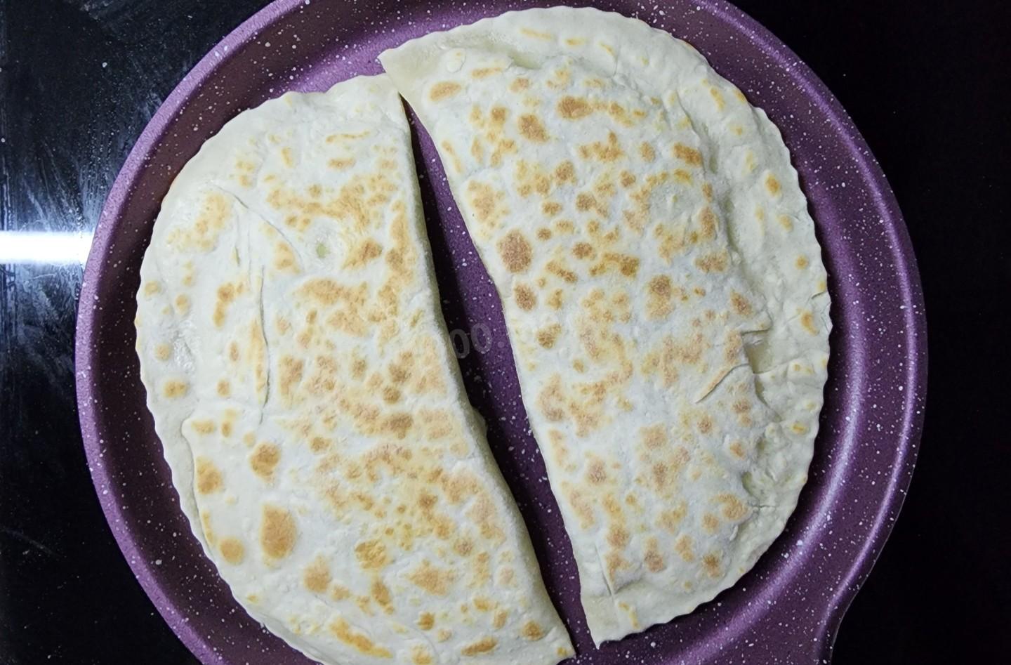 Разогрейте сухую сковороду на среднем огне. Масло не наливайте! Выложите кутаб на горячую сковороду. Жарьте с одной стороны до появления золотистых пузырьков и румяных пятен (около 1.5-2 минут).