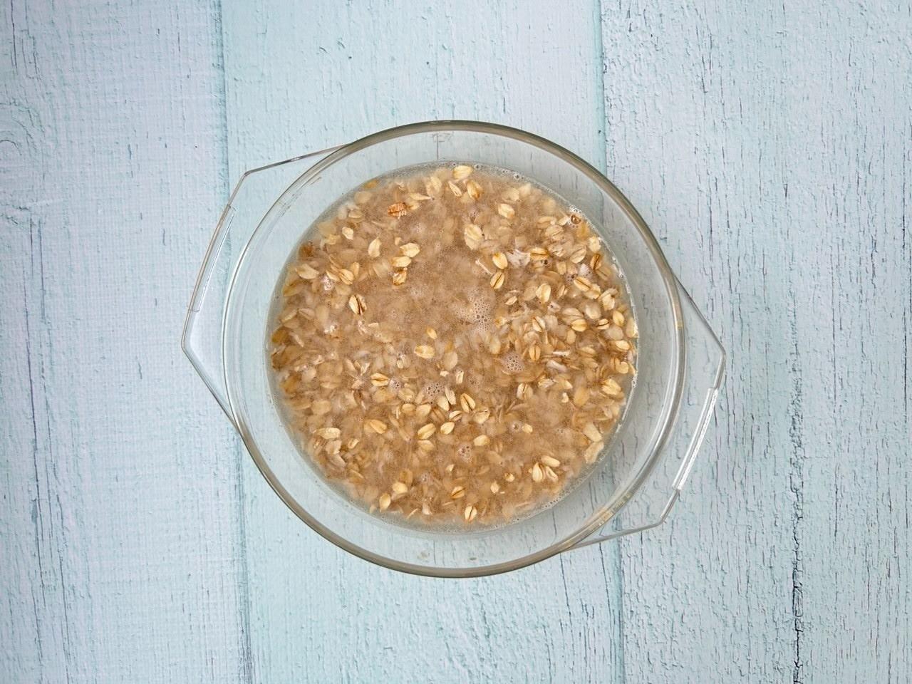 Овсяные хлопья залейте водой, перемешайте и поставьте в микроволновую печь примерно на 2 минуты при максимальной мощности. Точное время и мощность будут зависеть от вашей техники. Если вы готовите на плите, можно довести овсянку до кипения в сотейнике и варить 3–5 минут до набухания, либо просто залить кипятком и оставить под крышкой на 15–20 минут. Важно, чтобы хлопья полностью впитали влагу и остыли перед смешиванием с остальными ингредиентами.