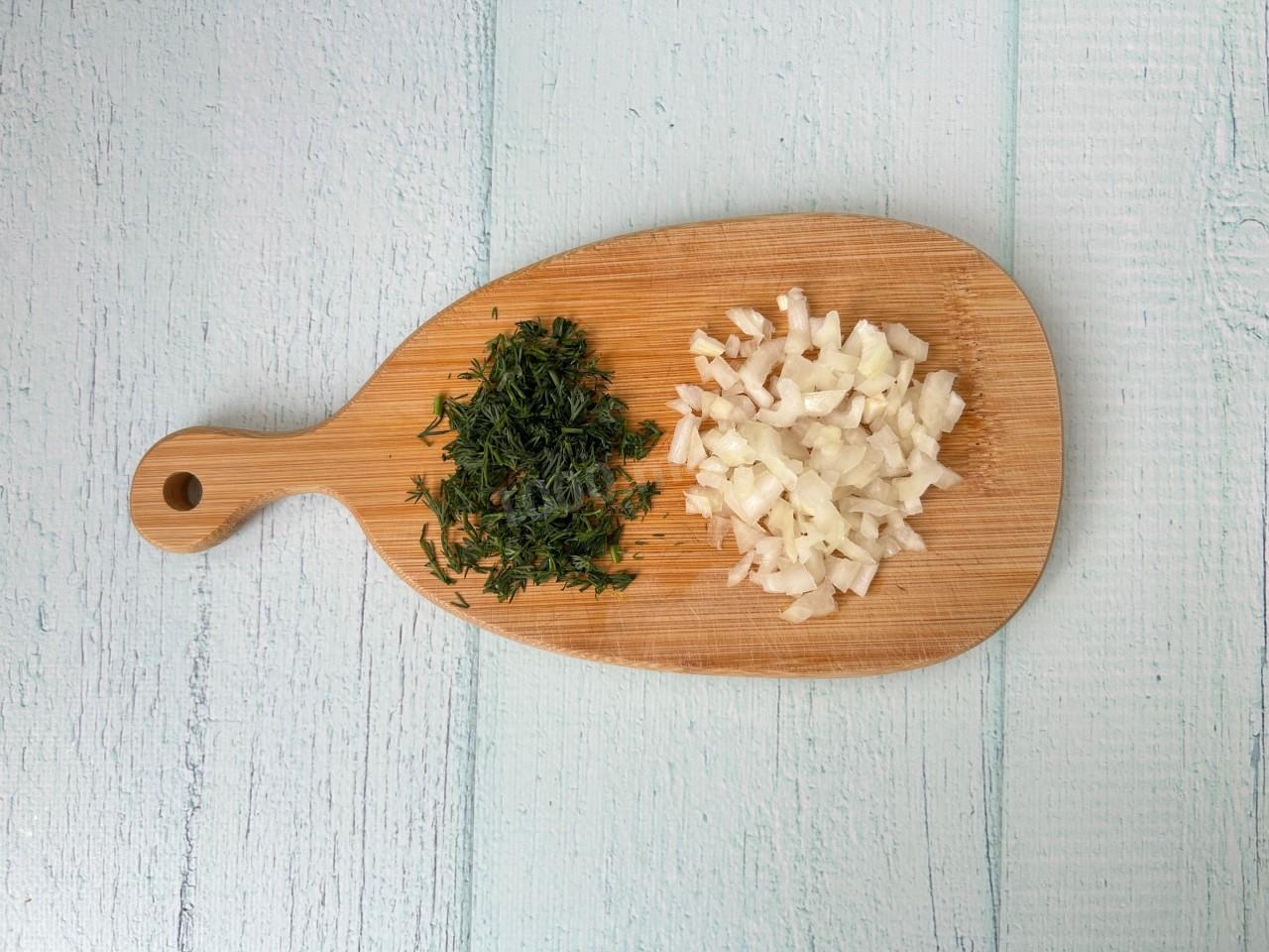 Репчатый лук очистите и нарежьте на мелкие кубики, зелень укропа промойте, обсушите на бумажном полотенце, мелко порубите. Для более насыщенного вкуса можно добавить 1–2 зубчика чеснока, пропущенных через пресс, или немного сушеного чеснока.