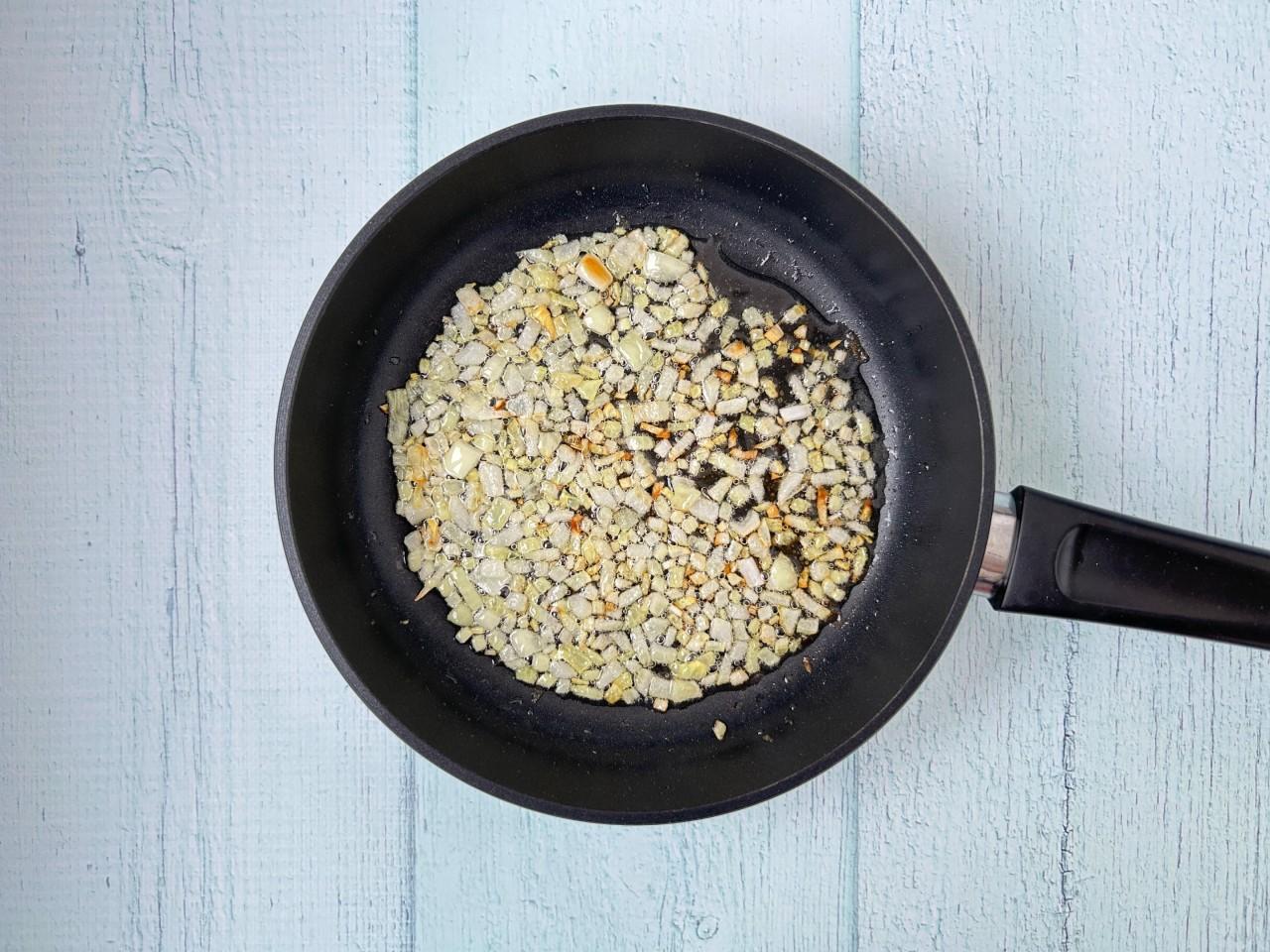 На сковороде разогрейте 1 ст.л. растительного масла, добавьте нарезанный лук и обжарьте до золотистого цвета. Не торопитесь: лук должен стать мягким и прозрачным, с легким карамельным оттенком — это уберет излишнюю резкость и добавит сладость в готовые котлеты.