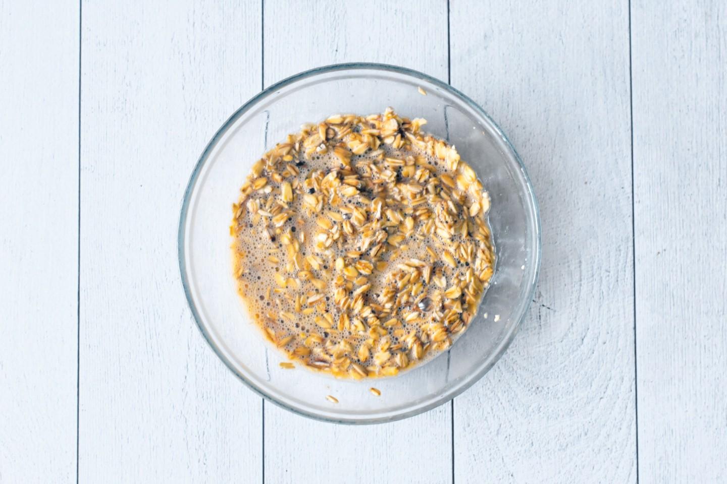 В мисочке взбейте вилкой яйцо до однородности. Всыпьте овсяные хлопья и перемешайте. Оставьте на 15-20 минут для набухания хлопьев.