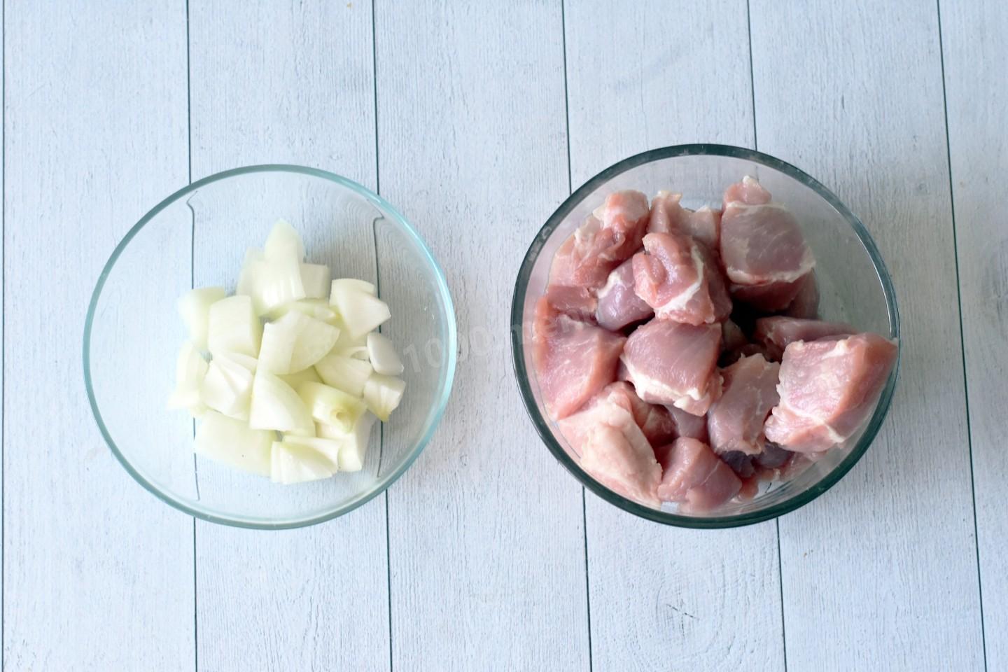 Свинину вымойте, обсушите и нарежьте средними кусочками. Луковицу нарежьте средними кусочками. Свинину можно заменить на курицу, говядину или на любой другой вид мяса по вашему желанию. Но учтите, что в таком случае время приготовления и калорийность блюда изменятся.