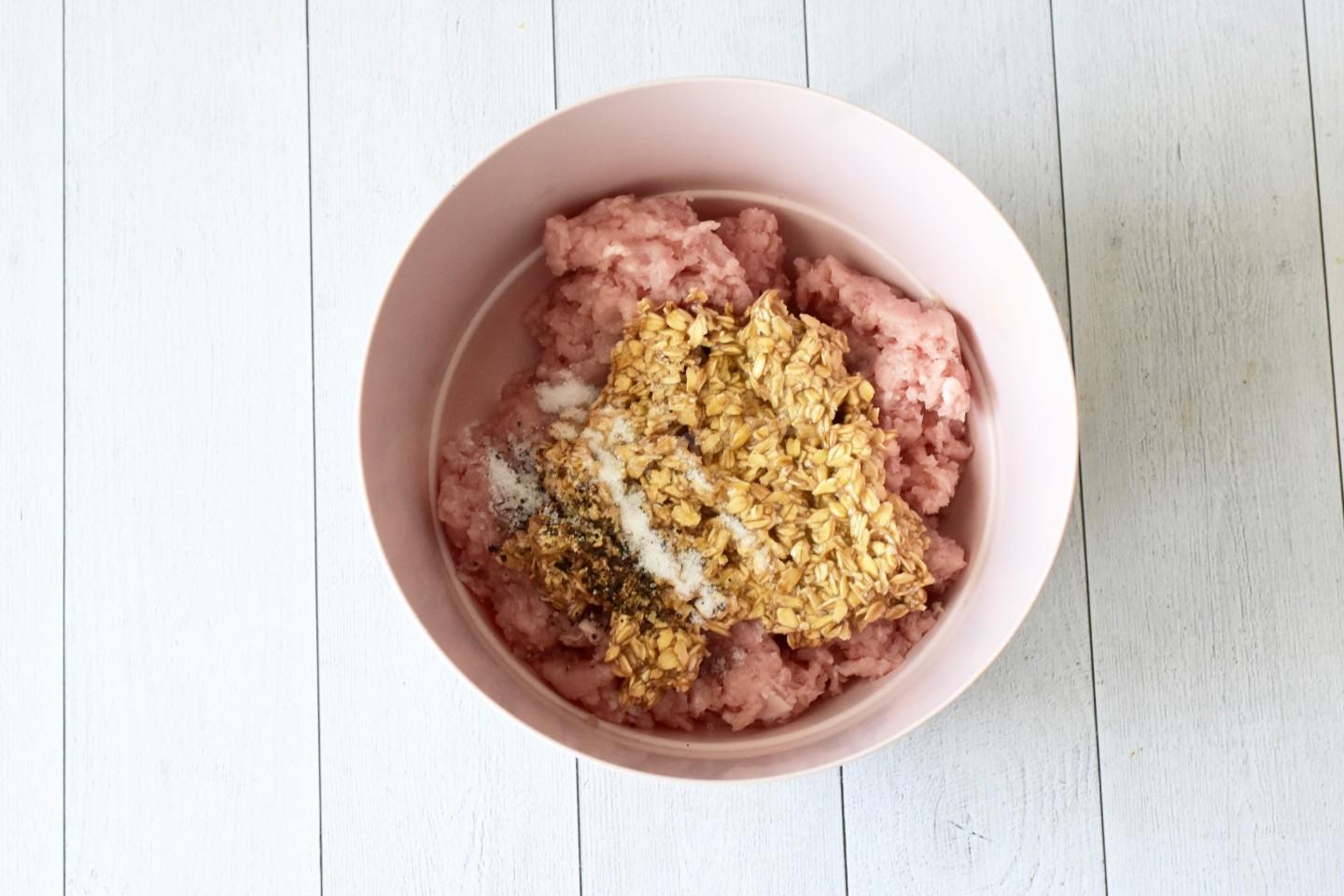 Свинину и лук перекрутите в мясорубке или измельчите в блендере. В мясной фарш выложите разбухшие овсяные хлопья, всыпьте соль и перец и перемешайте. Можете добавить другие специи по вкусу.
