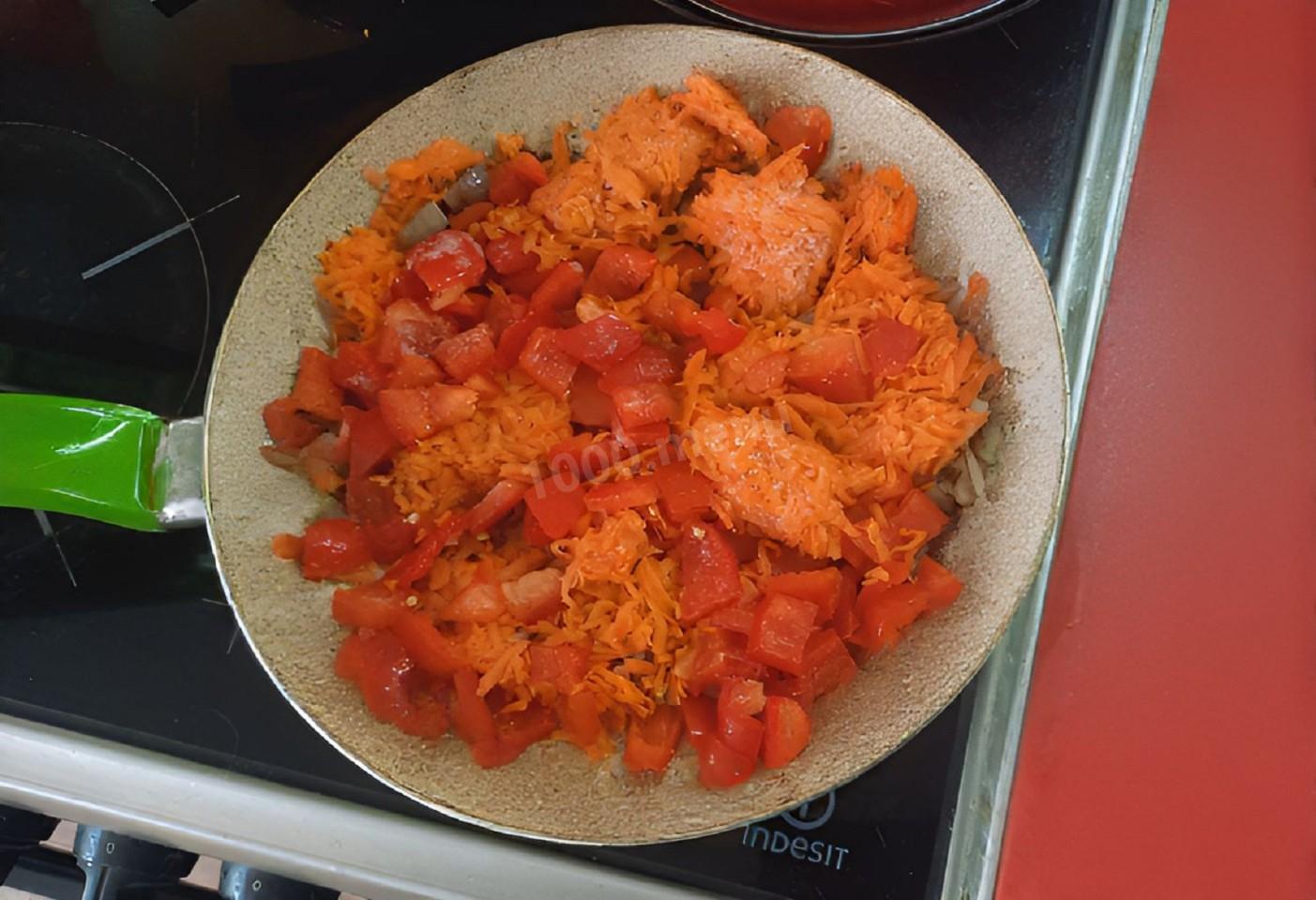 Нарезанный перец, неважно, будет ли это болгарский или ласточка, нарежу и добавлю вместе с натертой морковью. Обжариваю еще 7 минут, помешивая, пока морковь не станет мягче.